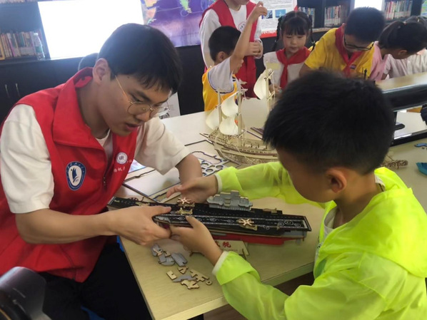 2021年7月9日,新番 “筑建深蓝梦 奋斗百年路”暑期社会实践团在镇江市宝塔路街道庄泉社区开展了“图流航海,言‘船’身教”活动。实践团以航海日为契机,以饱满的精神状态向小朋友介绍我国的航海史以及现代海防科普知识,指导小朋友拼装舰船模型,感受海防科技的魅力,迎接7月11日中国航海日的到来。通过亲自实践和主动讲述等多种形式来传播船海文化,坚定海洋强国之信念,增强社会责任感,升华自身思想。