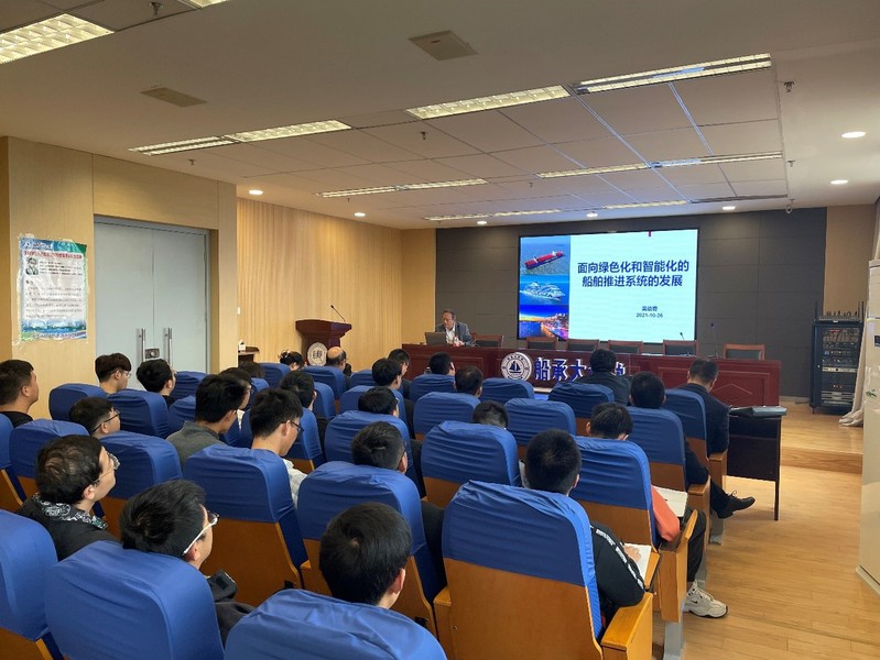 吴幼奇总监紧扣“节能减排,绿色船舶”这个主题从当前的国际形势出发,详细解读了当前国内外关于船舶绿色减排的方法与手段,通过能源、船型优化、大数据分析等手段详细解读了节能减排的各种先进技术,并着重讲解了外高桥造船有限公司所使用的先进技术。通过生动的案例和精确无误的数据分析,给同学们开展了一场兼具专业性丰与时代性的学术讲座,引起了在场同学的阵阵掌声。