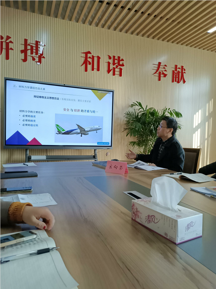 宋老师从课程思政的意义及存在问题出发,以《材料力学》课程为例解析课程思政的思考、元素挖掘、教学实践、教学设计及建设成效。宋老师讲到,一要认识到全面推进课程思政建设是落实立德树人根本任务的战略举措,要寓价值观引导于知识传授和能力培养之中,紧紧抓住教师队伍“主力军”、课程建设“主战场”、课堂教学“主渠道”,将显性教育和隐性教育相统一,以新工科思想为基础,结合学校定位、专业特点和课程特色,深挖课程思政元素。二要针对性地开展教学研讨,定制教学计划,精心教学设计;完善教学课件,深入交流示范,抓实课堂教学;创新实践环节,课内课外衔接,提升课程品质;形成从授课计划、教学设计、课堂讲解到课后实践的完整“课程思政”授课体系,培养工程师素养。三要注重在教学内容上体现思想性、前沿性、时代性,例题和习题体现高阶性、创新性、挑战度,思政设计有机融合、有深度、有广度。将教研活动、政治学习与党支部活动统一,牢牢把握思想理念和教育方向的统一,实行全员学政治、讲政治,全员开展课程思政。最后,要与学习景荣春精神结合起来,推进“课程思政育人聚合行动”,将课程思政扩展至第二课堂,实现全程思政育人。