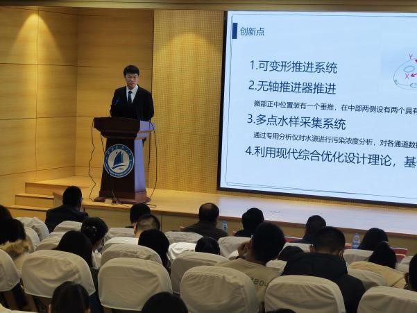 在江苏科技大学团委副书记徐剑的精彩致辞后,比赛正式拉开帷幕,参赛选手利用多媒体演示、视频展示方式在规定时间内对作品进行详细介绍,并由评委老师对选手进行提问和当场打分。大赛的作品精彩纷呈,既有智能与自动集于一身的减震救援艇,也有新型海上设备水上移动电桩;既有一种工业级观察型水下机器人,也有绿色水面漂浮垃圾清理装备。各评委老师在给予同学们高度认可的同时,也针对各个项目的不足之处给出了更好的改进建议,为同学们指明了下一步的创作方向。