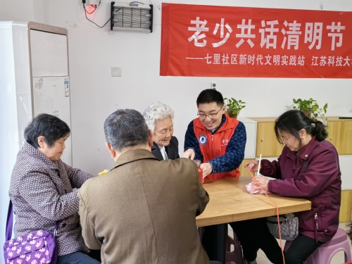 4月2日,新番 的同学们来到镇江高新区蒋乔街道七里社区大学生新时代文明实践站的慈善社工站,与社区联合开展“老少共话清明节 同做艾锤忆故人”活动,包括歇后语问答、清明节的介绍和艾草锤的制作。