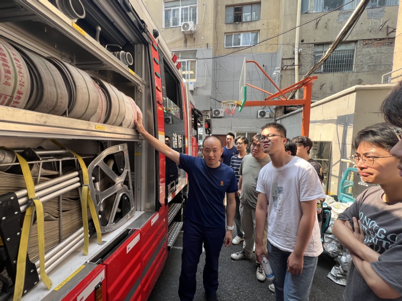 随后,消防救援人员带领同学们参观了各类消防救援车辆和消防救援装备,向他们介绍了不同救援车辆的用途消防站长结合船海专业特性,对比讲解水上消防难点,学子们纷纷记录要点。消防站随即演示“水雾喷淋系统”模拟船舶灭火场景,研究生分组操作水带连接、战术配合,在实操中深化“防、控、逃”一体化认知。