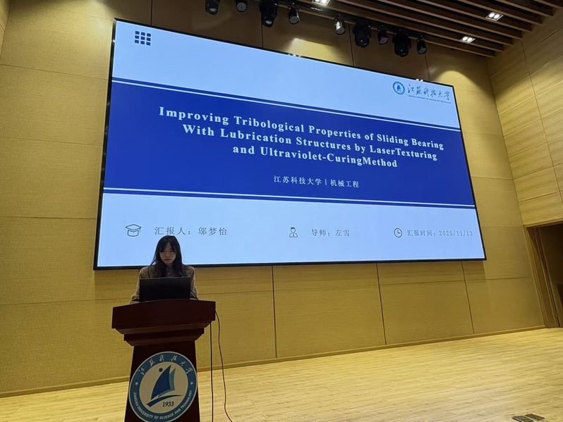 邬梦怡同学则针对低速重载工况下滑动轴承润滑难题,突破传统方案局限,采用激光织构与紫外光固化组合工艺,填充ZB与SiO₂构建新型润滑结构,有效改善了轴承摩擦学性能。五位同学的汇报内容扎实、逻辑清晰、亮点突出,不仅展现了扎实的科研功底,更带来了前沿的学术视角,帮助在场同学拓宽了研究视野,丰富了知识体系,现场交流氛围热烈。