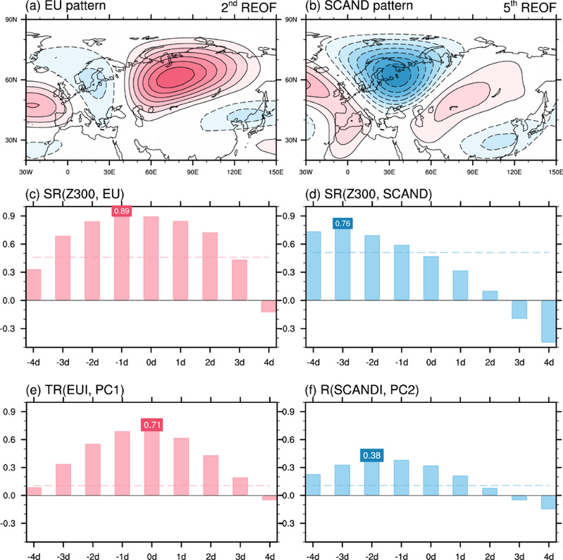 研究显示,东亚高空急流在次季节尺度上(10-25天)的强度和位置协同变化分别与发源于北大西洋西北部(冰岛)和东北部(挪威海)附近的纬向欧亚波列密切相关,两支波列在超前1天左右和超前2-3天时分别表现出典型的传统欧亚型(EU)和斯堪的纳维亚型(SCAND)遥相关波列结构特征(图1)。进一步研究表明,遥相关型的存在有助于在中高纬度地区形成有组织、大范围的波列传播过程,并调整相应急流模态下纬向风三极型异常结构的倾斜方向,增强急流变化幅度。这些特征与遥相关型缺位时的中低纬度路径及局地振荡为主的现象形成鲜明对比。同时,两种遥相关型的同时出现可能继续放大急流演变幅度,并对后续温度和降水异常产生复杂影响。北大西洋三极型海温异常是激发欧亚遥相关波列的重要原因之一,尤其该区域冷海温异常通过激发下沉运动及随之产生的高层辐合异常,在上地区主导激发了初始气旋性罗斯贝波源扰动异常,在反气旋性涡度异常的持续补偿作用下最终形成不断向下游传播的欧亚中高纬度波列。该研究从大气动力过程角度为团队多年来关于高空急流多尺度变化机理的研究补充了新的认识。
