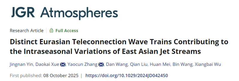 Yin, J., Xue, D., Zhang, Y., et al. (2025). Distinct Eurasian Teleconnection Wave Trains Contributing to the Intraseasonal Variations of East Asian Jet Streams. Journal of Geophysical Research: Atmospheres, 130(19), e2024JD042450. //doi.org/10.1029/2024JD042450