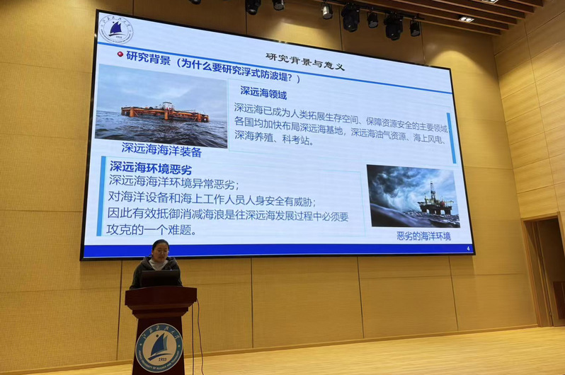 卢莉莉同学围绕新型浮式防波堤三维试验研究展开汇报,针对深远海海浪消减的核心需求,对比传统固定防波堤的应用局限,详细介绍了波浪水槽试验布置、多类型测量设备应用等关键环节,通过观察波浪砰击、翻卷等现象及分析相关系数变化,初步证实该新型浮式防波堤对长周期波具有优异的消波性能。