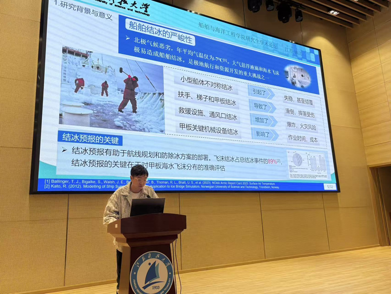 论坛现场,卢莉莉、常明水、邬梦怡、武道磊、帅华飞五位硕博研究生依次登台,分享各自在相关研究领域的探索成果与学术思考。现场还布置了论文海报展板,与会研究生围绕海洋工程材料、船舶动力系统优化、水下机器人控制等方向展示了10余幅学术海报,通过图文结合的形式呈现研究方法、实验数据与创新结论。展板区人头攒动,同学们驻足交流研究细节,形成了“台上汇报+台下展示”的立体化学术互动模式。